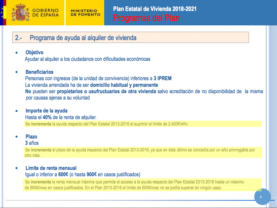 Este nuevo Plan Estatal de Vivienda 2018 -2021, elaborado por el Ministerio de Fomento entrará en vigor este 2018 y tendrá una vigencia de cuatro años. Las ayudas favorecerán a los jóvenes menores de 35 años y mayores de 65 años, ya sea en la compra como en el alquiler de una vivienda.